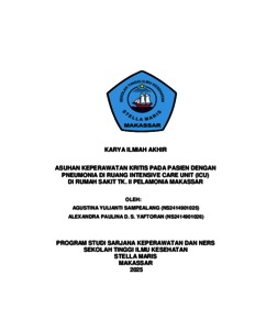 SAMPEALANG, AGUSTINA YULIANTI and YAFTORAN, ALEXANDRA PAULINA D. S. (2025) ASUHAN KEPERAWATAN KRITIS PADA PASIEN DENGAN PNEUMONIA DI RUANG INTENSIVE CARE UNIT (ICU) DI RUMAH SAKIT TK. II PELAMONIA MAKASSAR. Karya Ilmiah Akhir (KIA) thesis, STIK Stella Maris Makassar.