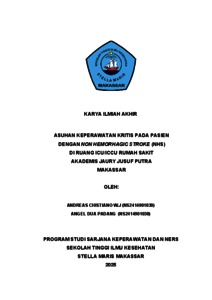 W.J, ANDREAS CHISTIANO and PADANG, ANGEL DUA (2025) ASUHAN KEPERAWATAN KRITIS PADA PASIEN DENGAN NON HEMORHAGIC STROKE (NHS) DI RUANG ICU/ICCU RUMAH SAKIT AKADEMIS JAURY JUSUF PUTRA MAKASSAR. Karya Ilmiah Akhir (KIA) thesis, STIK STELLA MARIS MAKASSAR.